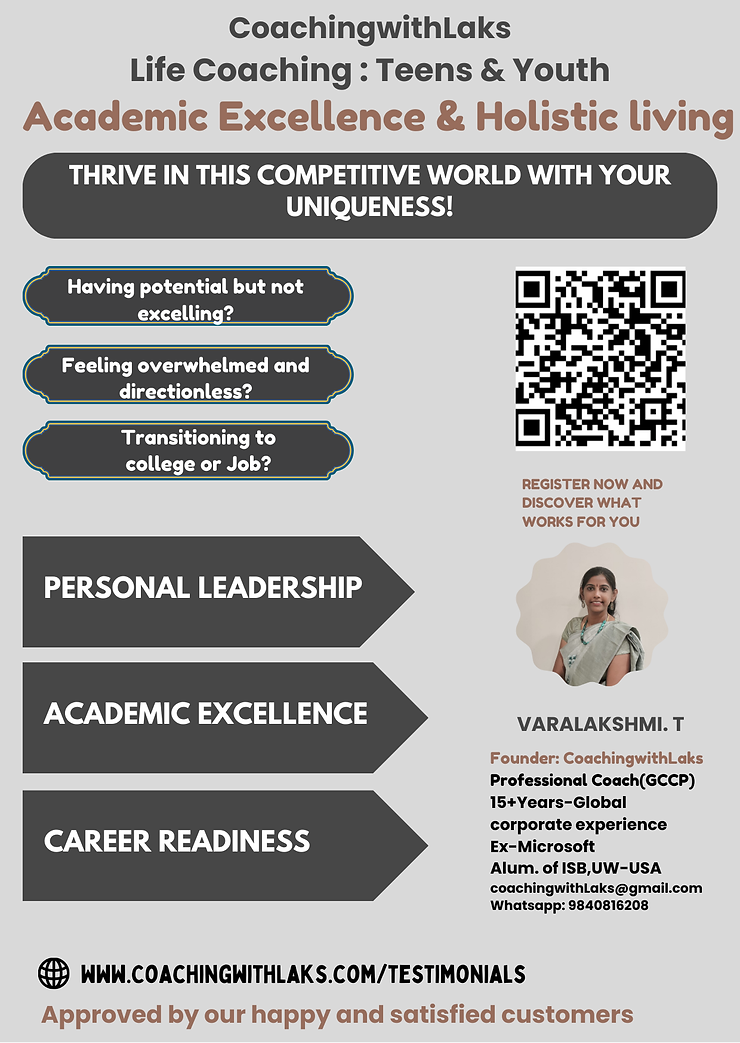 Teens / Youth : Are you ready to elevate your life and thrive in this competitive world? CoachingwithLaks programs are designed to meet you where you are and help you achieve your unique goals.
